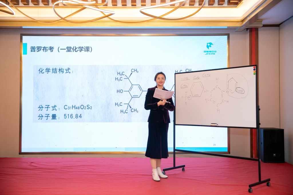 隨后總經理王軼超通過一堂生動的化學課,向大家講解基礎有機化學知識,拆分普羅布考分子結構式,增加大家對產品的了解。