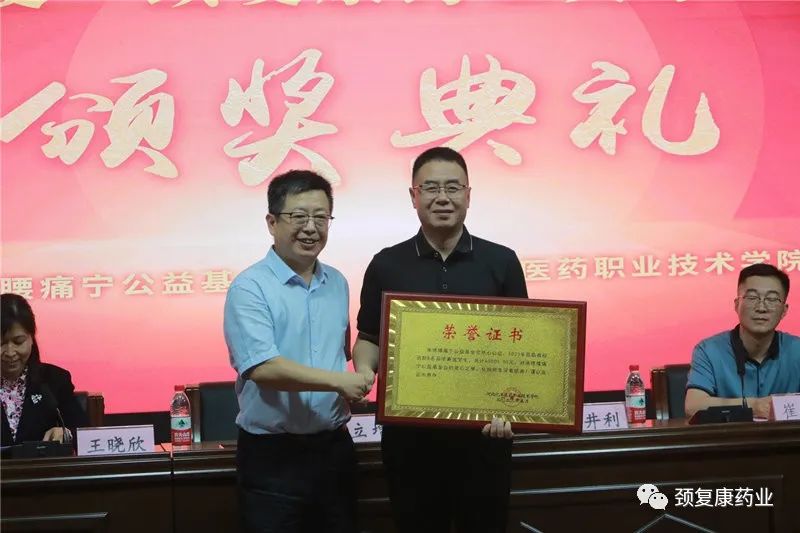 在兩校的頒獎儀式上,劉井利秘書長就與兩校的校企合作歷程做了回顧,贊譽了學校高質量發展的成績,肯定了學校培養人才的戰略舉措,希望學生努力學習,取得更好的學習成績。同時,劉井利就頸復康藥業的發展歷程、發展特色、取得的成就等做了簡要介紹;并詳細說明了企業成立腰痛寧公益基金會的初衷,以及多年來對公益事業的執著與踐行。